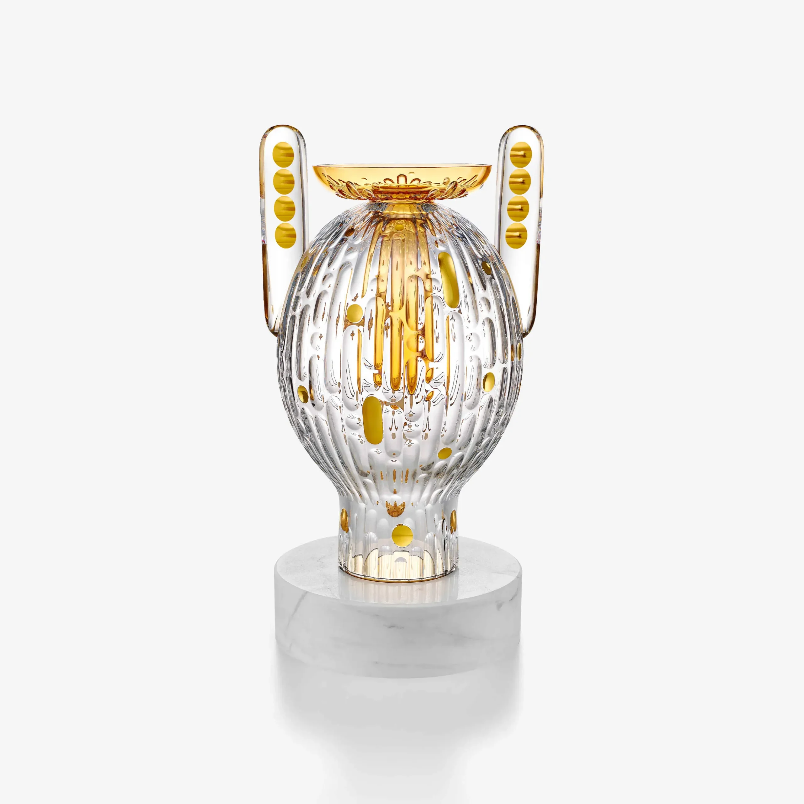 Imaginée par Jaime Hayon, la collection Faunacrystopolis forme une joyeuse tribu de six animaux de cristal en édition limitée dont un Lapin aux oreilles dressées ! Jaime Hayon, l’enchanteur, impose à nouveau son style fantastique dans l’univers Baccarat et offre une vision singulière de la faune sauvage. Le plus cool des designers donne un nouveau twist à la sculpture animalière. Il revisite les codes existants pour inventer de nouvelles formes et recréer la personnalité de chaque espèce : les silhouettes toute en rondeur se parent de teintes électriques, de tailles profondes et de motifs géométriques. Entièrement réalisée à la main par les artisans de Baccarat, chaque pièce est unique et symbolise le savoir-faire exceptionnel de la manufacture. Posé sur un socle en marbre blanc, le lapin en cristal clair et miel célèbre la beauté de la nature et symbolise, entre fantaisie et émotion, l’importance de protéger le monde qui nous entoure.