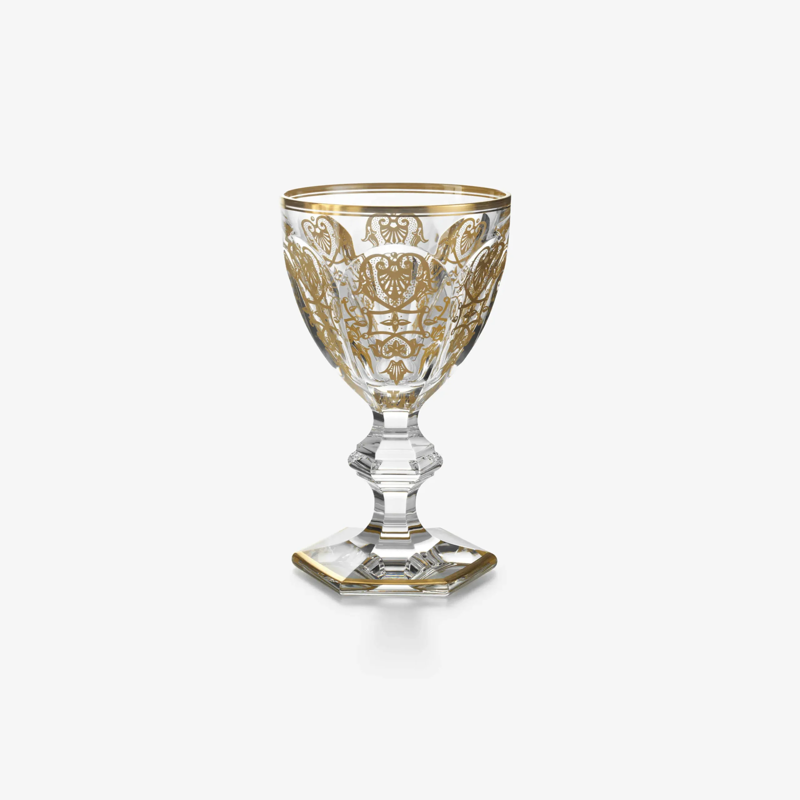 Le verre Empire en cristal Baccarat reprend l’architecture du verre Harcourt mais avec un fin liseré or autour du buvant et un délicat motif doré sur les côtes plates de la paraison. Le verre Empire revisite la noblesse classique de la forme Harcourt. Il n’est que scintillement de cristal clair et d’or. La jambe conserve la ligne géométrique et la taille en biseau de son modèle, mais l’hexagone de la base est ceint d’un liseré or. La collection Empire comprend aussi une flûte à champagne et un verre à cocktail. Un décor doré caractérise également la collection Rivoli.